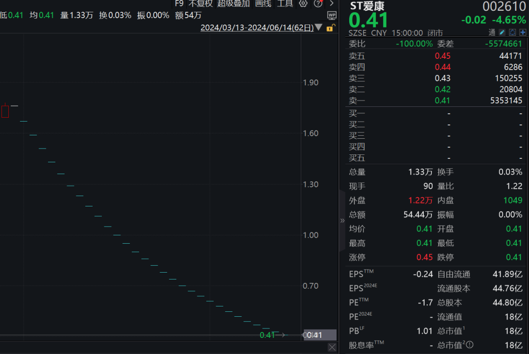 Wind数据闪现,戒指5月20日,ST爱康共有激动27.68万户。自2023年年报闪现终了,复牌后的ST爱康,仍是归并29日跌停,最新收盘价仅0.41元/股,已锁定退市。