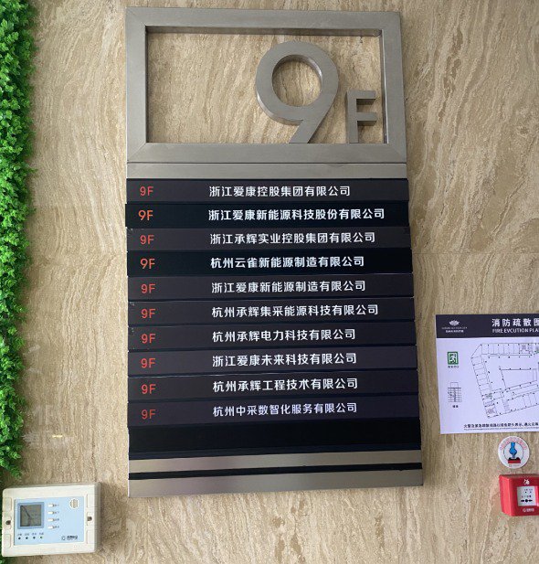 ST爱康、承辉海外所在的9楼,亦然“爱康系”公司的连络办公地。楼层索引图闪现,共处一层的公司包括浙江爱康控股集团有限公司、浙江爱康新能源科技股份有限公司(ST爱康的全称)、浙江爱康新能源制造有限公司、浙江承辉实业控股集团有限公司等共计10家公司。